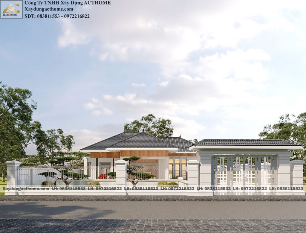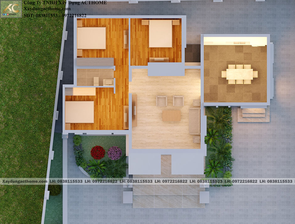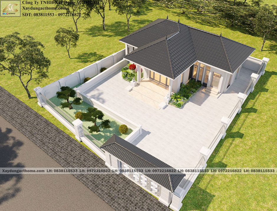 Ngôi nhà có kích thước mặt tiền 14.55mx11.89mVới kích thước như trên có thể bố trí được: 3 phòng ngủ, 1 vệ sinh chung, 1 phòng bếp, 1 phòng khách kết hợp với phòng thờ. không gian sảnh khá rộng với diện tích khoảng 8 m2. Không gian ngôi nhà được bố trí nhiều cửa sổ rất thông thoáng cho việc lấy không khí và gió tự nhiên cho ngôi nhà