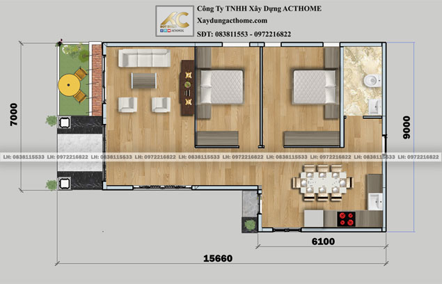 2 phòng ngủ Nhà cấp 4 mái thái cực đẹp – DDNC406 Posted on 06/06/202201/06/2022 by admin Phối cảnh công trình 15.6mx9m mặt đứng công trình nhà cấp 4 mái thái Mặt bằng công năng công trình